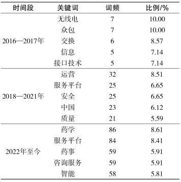近年来,“办事”做为经济增加的主要动力,其尺度化对提拔办事质量、推进消费升级具有主要意义。“办事”这一环节词正在平易近政部注册集体发布的集体尺度中呈现频次高达8。14%。对这类集体尺度做词频阐发发觉,尺度次要集中正在办事平台、药学、运营、平安、质量等环节范畴(如图4所示),用于规范和提拔办事行业的质量取程度,鞭策办事行业的专业化和精细化成长。进而,拔取3个阶段环节词词频比例排名前20且总比例最高的5个环节词(如表3所示)进行进一步阐发。2016—2017年,环节词次要集中正在手艺层面,如“无线电”“众包”“互换”等,侧沉办事行业的手艺规范和根本办事尺度的制定。2018—2021年,环节词转向“运营”“办事平台”“平安”等,着沉关心运营质量和平安性。2022年至今,环节词则更多地涉及“药学”“办事平台”“药事”等,起头向高端化、智能化标的目的成长,愈加沉视办事的专业化和智能化程度提拔。