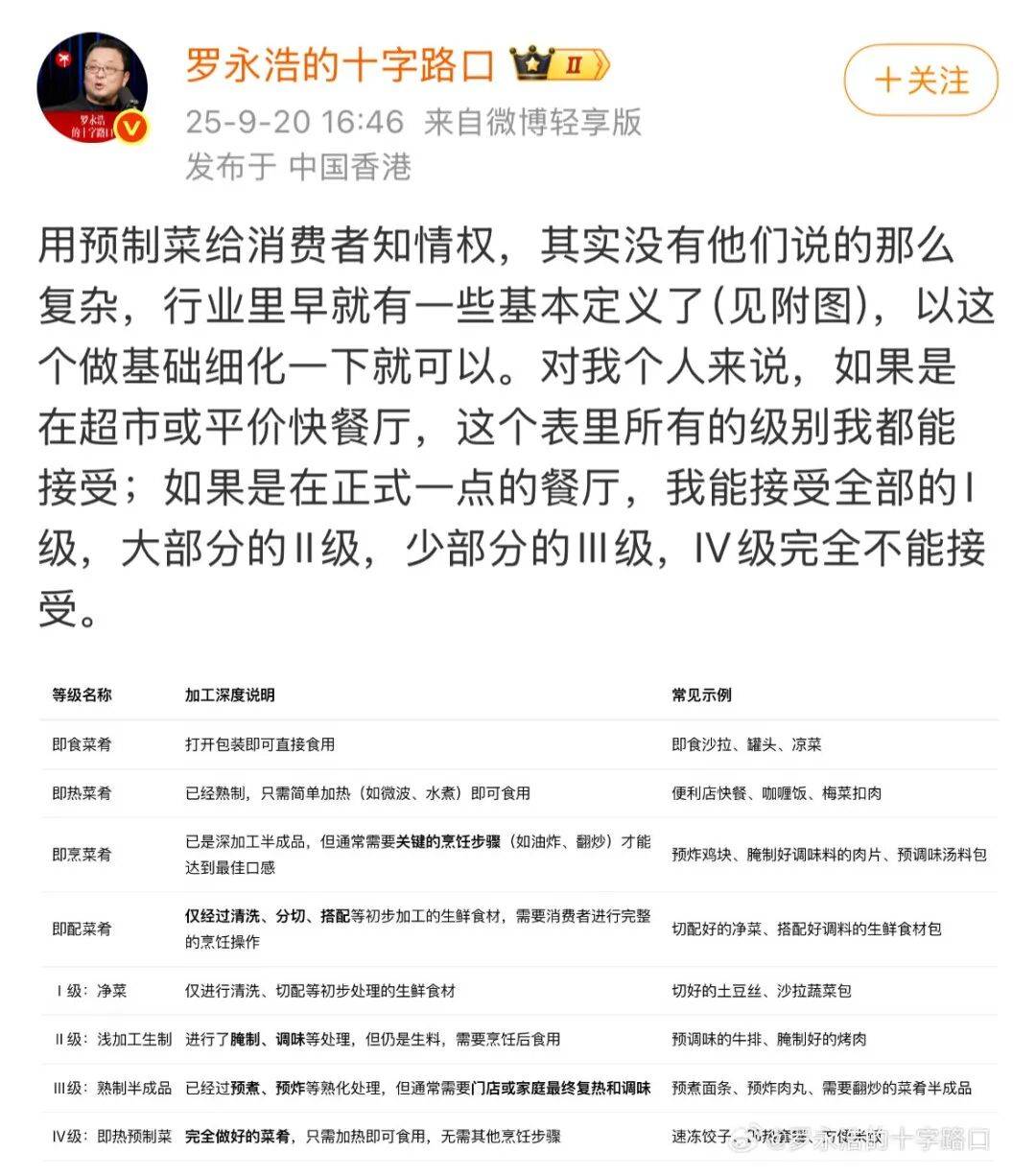 用预制菜给消费者知情权,其实没有他们说的那么复杂,行业里早就有一些根基定义了(见附图),以这个做根本细化一下就能够。对我小我来说,若是是正在超市或平价快餐厅,这个所有的级别我都能接管;若是是正在正式一点的餐厅,我能接管全数的I级,大部门的II级,少部门的III级,IV级完全不克不及接管。