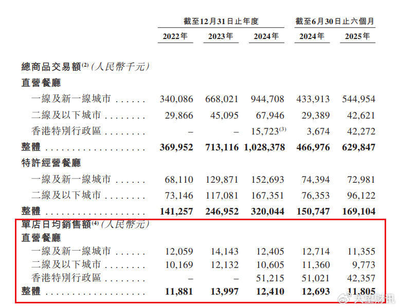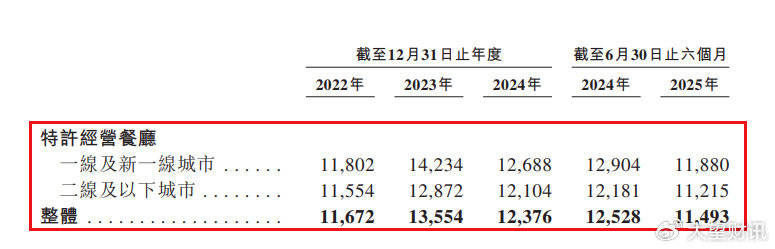客单价持续走低叠加单量下滑,间接拖累单店盈利,曲营餐厅单店日均发卖额从2023年的1。40万元降至2024年的1。24万元。2025年上半年,其曲营餐厅和特许运营餐厅的单店日均发卖额别离同比削减888元和1035元。