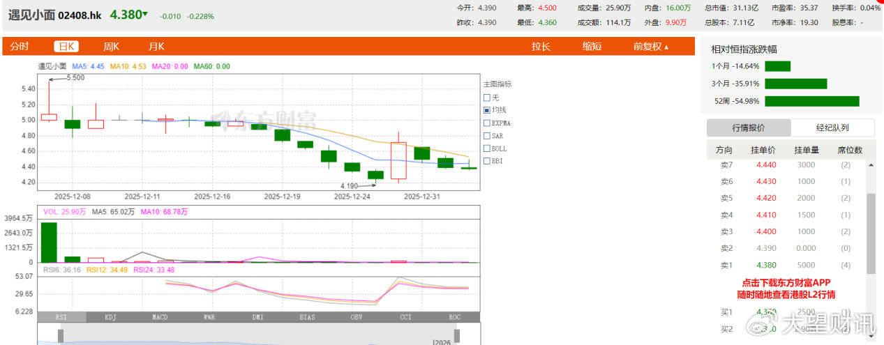 现在,距离碰见小面上市已一月不足。然而,顶着425。97倍超额认购热度和高瓴本钱、海底捞等奢华基石阵容背书的碰见小面,上市首月的表示却未能婚配市场预期。到持久存正在的食物平安、再到财政布局失衡取单店盈利下滑的窘境,这家连锁面馆品牌反面临着本钱化道上的多沉。碰见小面的上市首秀即“开门黑”,股价表示成为其首月最凸起的负面标签。2025年12月5日,公司以5港元/股低开近29%,较7。04港元的刊行价大幅折让,最终收报5。08港元,跌幅达27。84%,总市值仅约36。1亿港元。正在此前,碰见小面引入了包罗高瓴本钱旗下HHLR Advisors、海底捞新加坡公司等基石投资者,这些机构合计认购2200万美元股份。若以此粗略计较,开盘首日基石投资者浮亏超4000万港元。按照碰见小面披露消息,该公司全球行9736。45万股H股,占刊行后总股本的13。7%,刊行价定为每股7。04港元,总刊行规模约6。85亿港元。此中公开辟售973。65万股,实现425。97倍的超额认购;国际发售8762。8万股。公开辟售阶段425。97倍的超额认购未能为股价支持。正在上市后的一个月内,碰见小面股价并未呈现反弹迹象。截至2025年12月29日收盘,碰见小面股价降至4。25港元/股,较刊行价跌幅已超39%。虽然12月30日受海外门店开业动静影响,股价呈现11。06%的反弹,收报4。72港元/股,但相较于刊行价仍下跌32。95%。2026年1月5日收盘,碰见小面股价为4。38港元/股,跌幅0。23%,总市值跌至31。13亿港元。